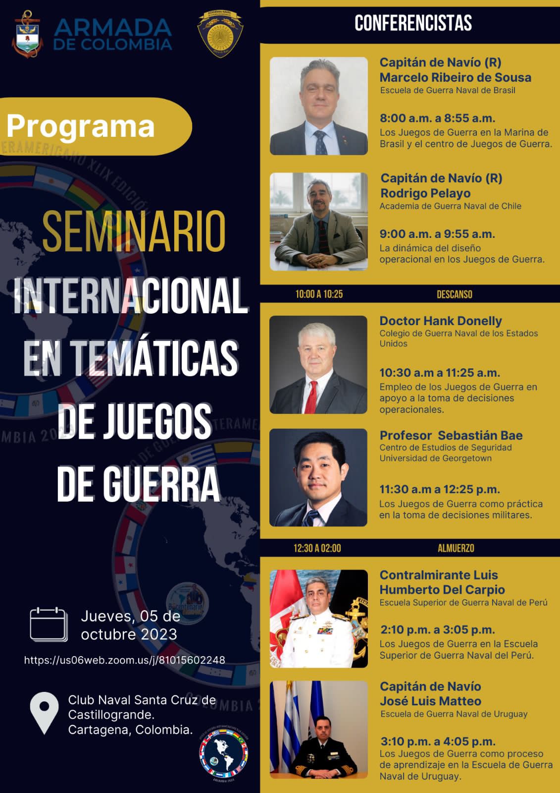 Entre el 2 y 6 de octubre se llevó a cabo la conferencia de clausura del juego de guerra interamericano 2023 en el Club de Oficiales de Cartagena, organizado por la Academia Naval de Estudios Estratégico de la Armada de Colombia, con la participación del Subdirector Académico de la Academia Naval CF Patricio Puyol, el CF CF IM Jorge Serón López, jefe del departamento de planificación y conducción operacional, y el profesor civil Rodrigo Pelayo González, profesor de la cátedra de operaciones navales y juegos de guerra.
